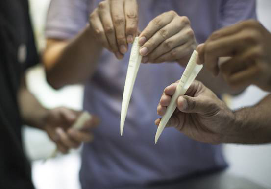 Workers from a tech company in Guangzhou create plastic beaks with 3D-printing technology on July 2, 2016. The tech company later called the South China University of Technology for help to produce the beak with titanium alloy. [Photo/VCG]