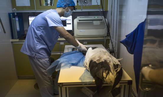 A vet takes Lili to an X-ray machine to examine its beak at an animal hospital in Guangzhou, Guangdong province, on July 10, 2016. [Photo/VCG]