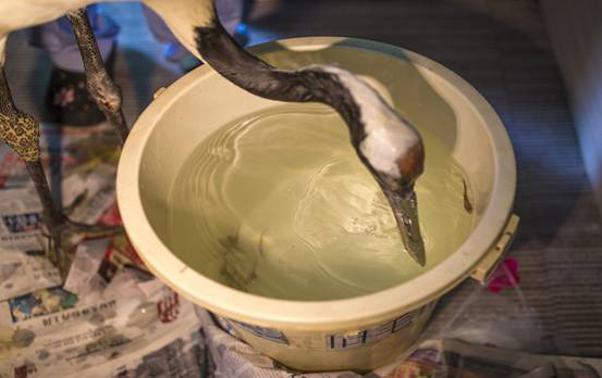 Vets feed Lili, a red-crowned crane with broken beak, at an animal hospital in Guangzhou, Guangdong province, on July 5, 2016. The crane had broken its upper beak when it fought with other cranes in early June. [Photo/VCG]